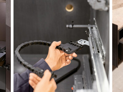 AMPEROS AC posiada gniazdko zintegrowane bezpośrednio z prowadnicą mebla. Dzięki temu urządzenia mogą być podłączone i zasilane wewnątrz szuflady, a kable pozostają zupełnie niewidoczne. To idealne rozwiązanie do łazienki (np. suszarka), sypialni (ładowarka), czy kuchni (robot kuchenny).