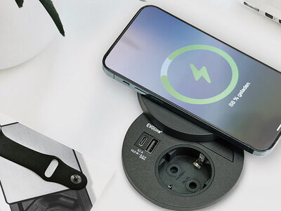 Z pokrywą DisQ Circle80 zyskuje kolejną funkcję, bezprzewodowe ładowanie zgodne ze standardem Qi. Smartfony można wygodnie odkładać zarówno przy zamkniętej, jak i otwartej pokrywie, a urządzenia z magnetycznym pierścieniem są stabilnie utrzymywane na miejscu. Dzięki temu Circle80 staje się nie tylko praktycznym gniazdem zasilania, lecz wszechstronnym centrum energetycznym dla nowoczesnego miejsca pracy.