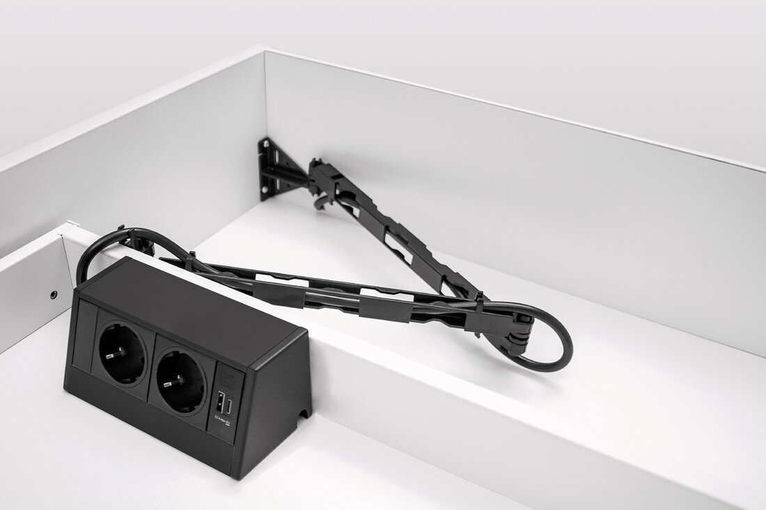 Montaż jest prosty: Wing umieszczany jest z tyłu szuflady i prowadzi kable wzdłuż tylnej ścianki, oszczędzając miejsce. Elastyczne ramię można zamontować po lewej lub prawej stronie, poziomo albo pionowo, co pozwala na dopasowanie do różnych konstrukcji mebli. Dzięki temu możliwe jest zintegrowanie gniazd zasilania lub portów ładowania bezpośrednio w szufladzie, przy jednoczesnym zachowaniu czystej powierzchni blatu.