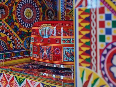 Typowe garnki z terakoty, malowane zgodnie z tradycją sycylijskiego malowania wózków, zainspirowały kolorowy i wspaniały projekt dużego tostera. Centralnym motywem tostera jest trinacria, symbol używany od wieków na samej Sycylii, który również zdobi regionalną flagę Sycylii i można go znaleźć na całej wyspie. Wzory, które łączą się harmonijnie, są rozmieszczone na całym tosterze i łączą się, tworząc zaokrąglony ogólny obraz.