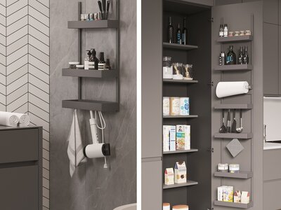 Wykorzystuje on już istniejące, ale wcześniej w większości niewykorzystane miejsce po wewnętrznej stronie frontów meblowych, po wewnętrznej stronie ścian szaf. ADD Door można również zamontować w dowolnym innym miejscu na ścianie. Tam gdzie go zamontujemy natychmiast powstaje dodatkowa, łatwo dostępna przestrzeń. System ten oferuje nie tylko komfort użytkowania, ale również montażu. Może być indywidualnie dostosowywany do potrzeb i rozbudowywany w bardzo prosty sposób, zaledwie w ciągu kilku sekund.